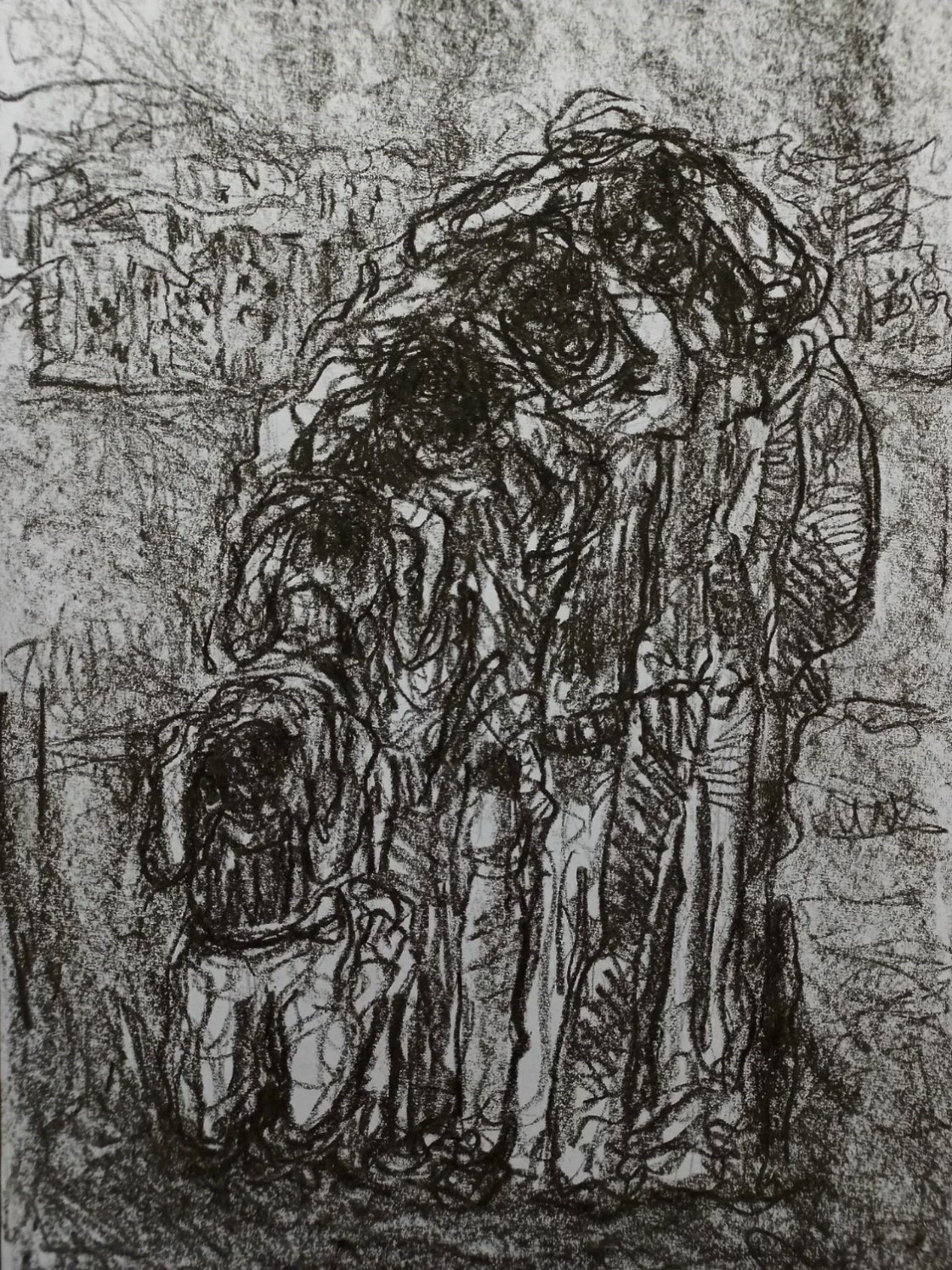 chargé de bois de chauffage, et avec l'idée d'une nouvelle toile… Le visage