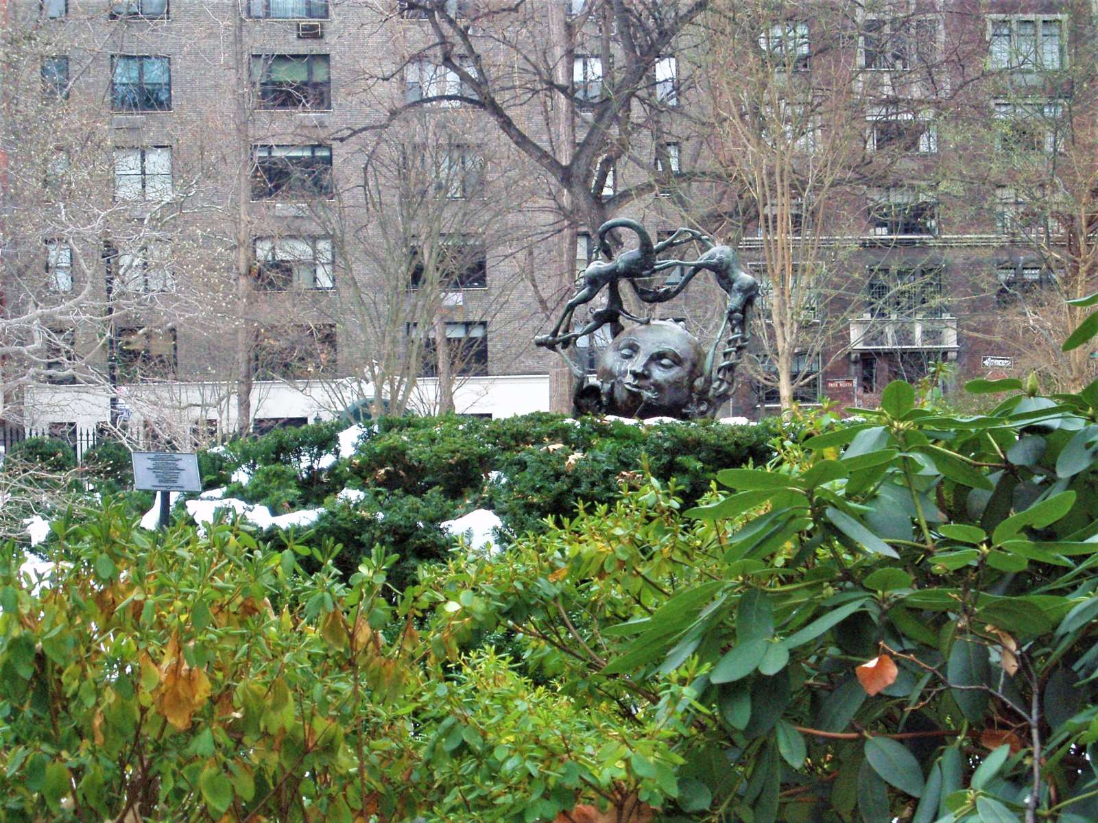 patiemment. Au pied d’un arbre entouré de grillages, un panneau indique « Please curb your dog ».
